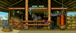 National Park — Ryo: A stable that likewise serves as a karate academy. Features a greyness equus caballus, wooden pillars, tires, ropes, hay, a lamp, a burlap purse, a sail, a pitchfork, an overturned wheelbarrow, a saddle and a drum that serves as a punching bag, as well Ryo's motorbike and leafless trees.